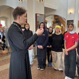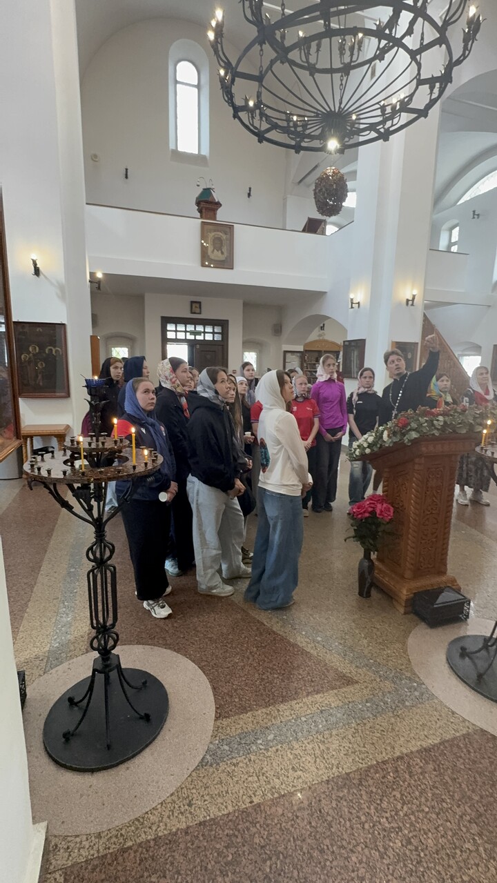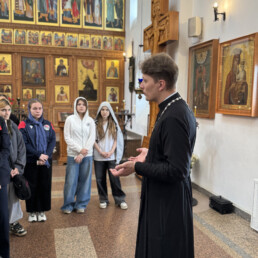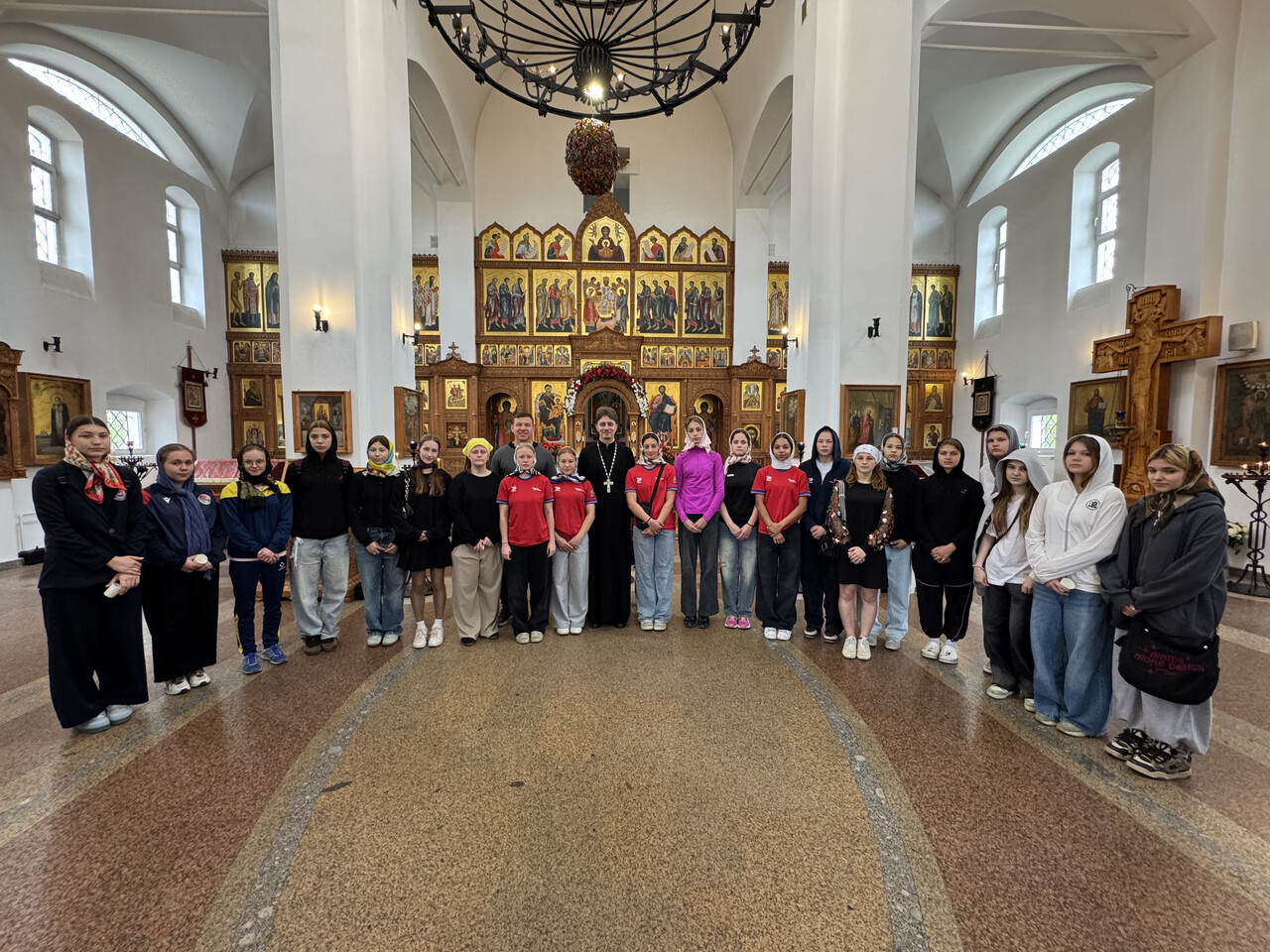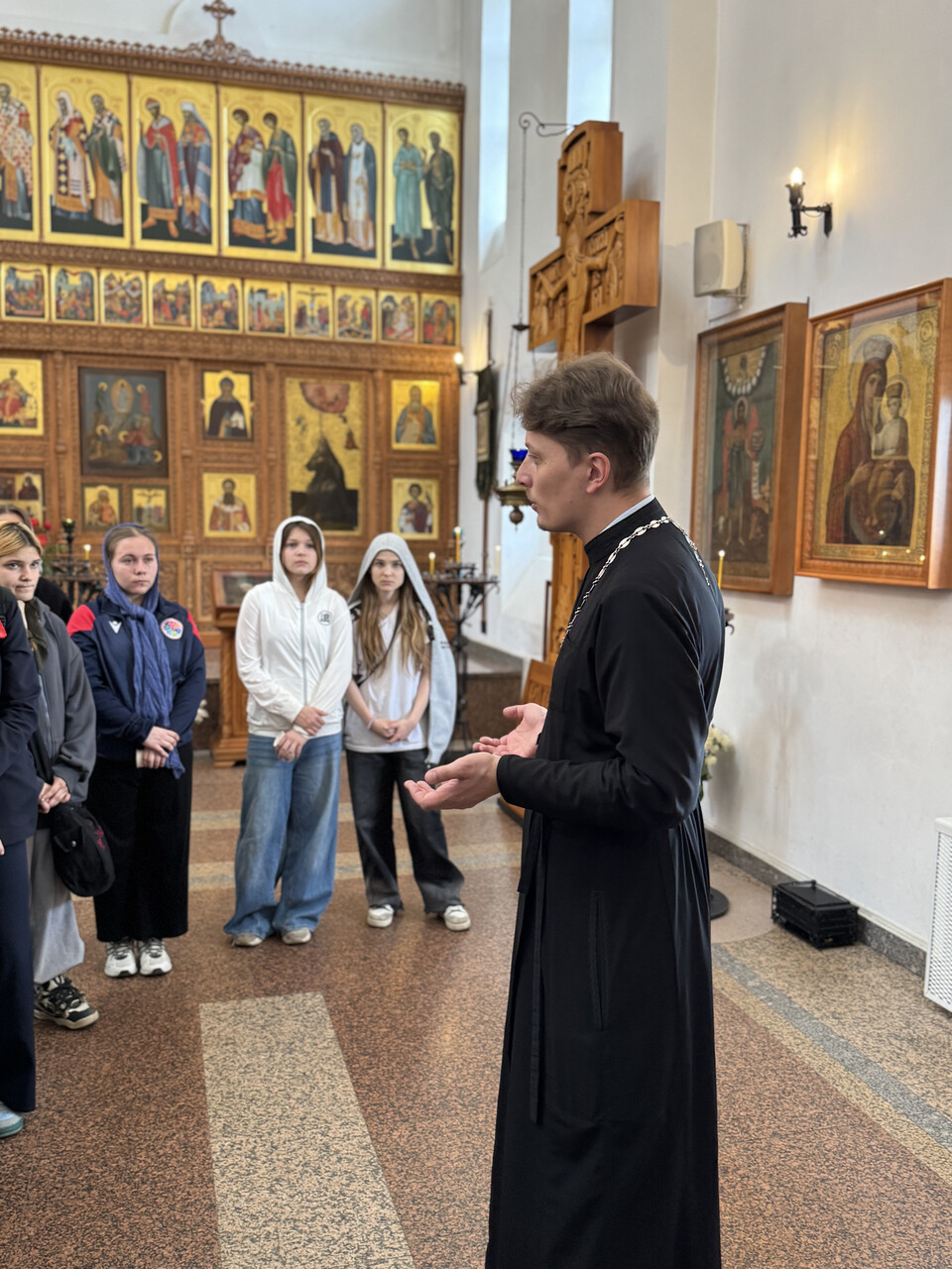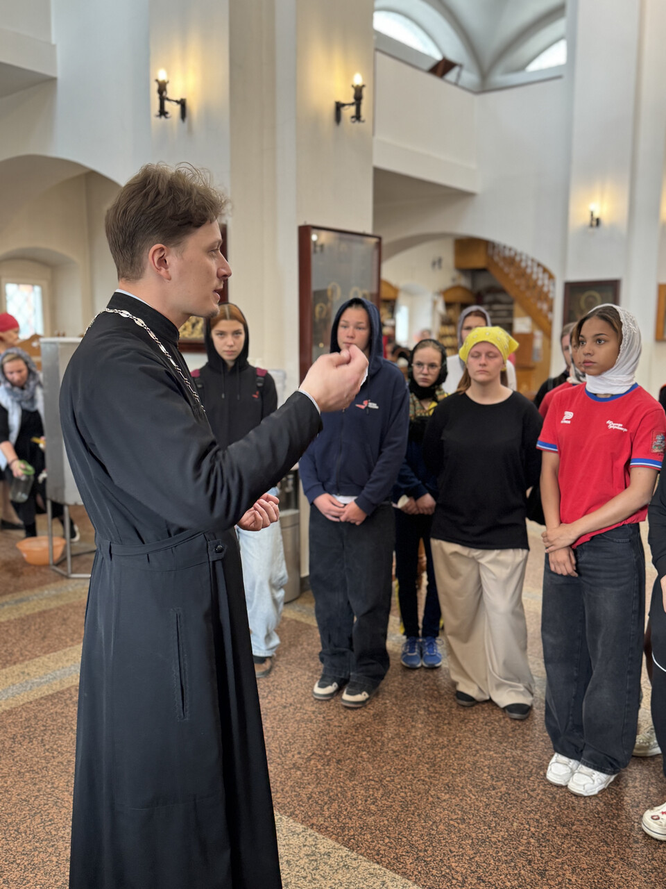Ответственный по молодёжи и спорту в благочинии клирик храма священник Иоанн Слобжин рассказал юным спортсменам о празднике Пасхи и провёл экскурсию по храму.