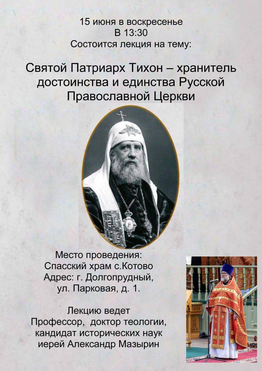 В воскресенье, 15 июня, в рамках мероприятий, посвящённых 100-летию со дня блаженной кончины Патриарха Тихона, в Спасском храме (Котово) состоялась лекция профессора ПСТГУ, доктора церковной истории, доктора теологии священника Александра Мазырина «Святой Патриарх Тихон – хранитель достоинства и единства Русской Православной Церкви».