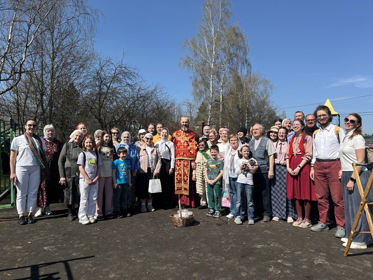 На Пасху настоятель Покровского храма мкр. Шереметьевский г. Долгопрудный иерей Николай Лузанов совершил молебен на стадионе в мкр. Шереметьевский.