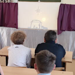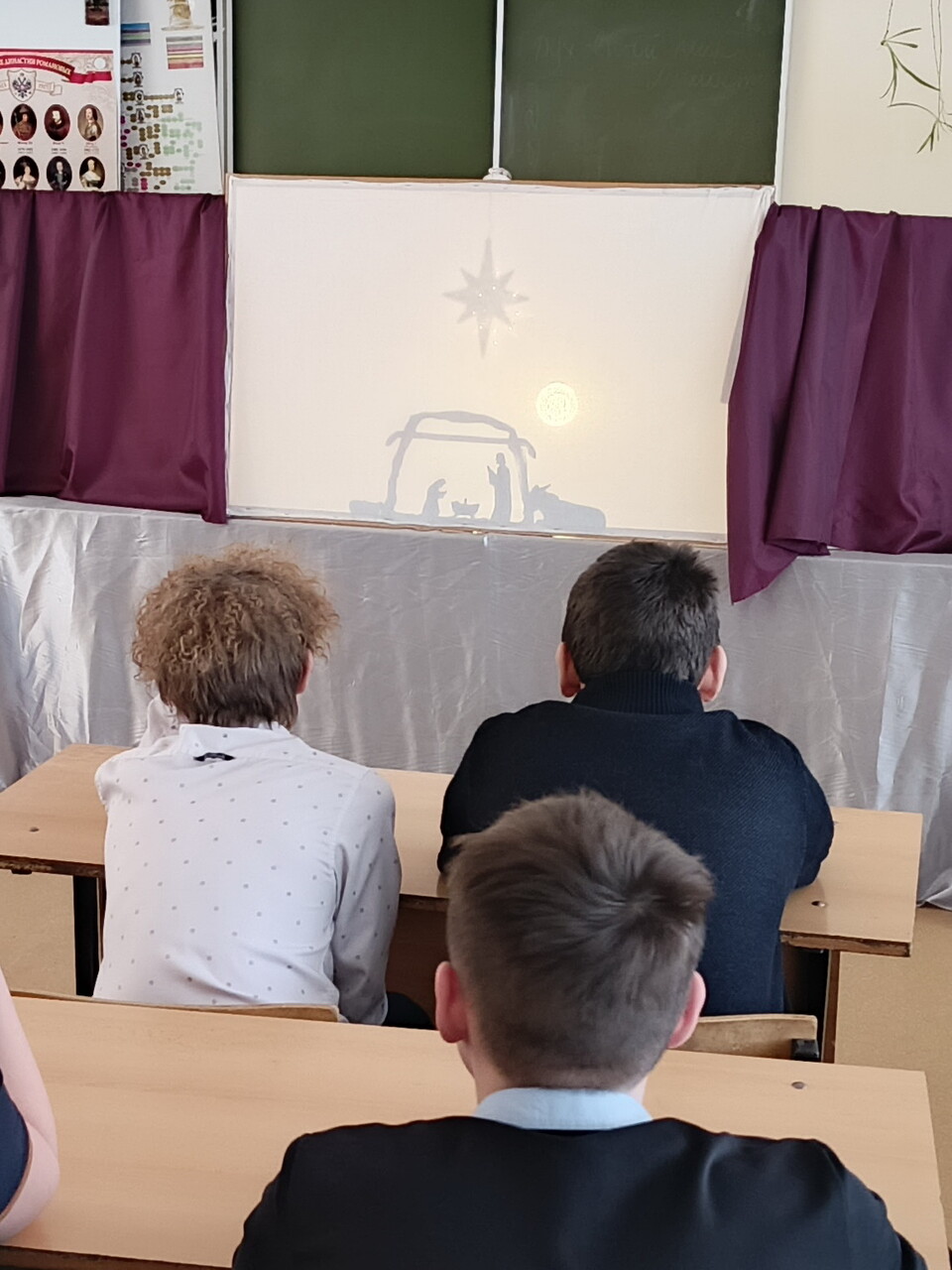 Гимназисты из 7 класса показали гостю и своим одноклассникам вертепный спектакль теней. Спектакль был подготовлен учениками для показа в начальной школе в преддверии праздника Рождества Христова, он инсценирует евангельскую историю рождения Господа нашего Иисуса Христа.
