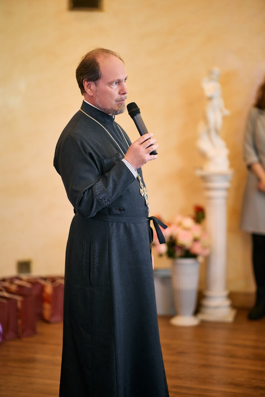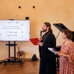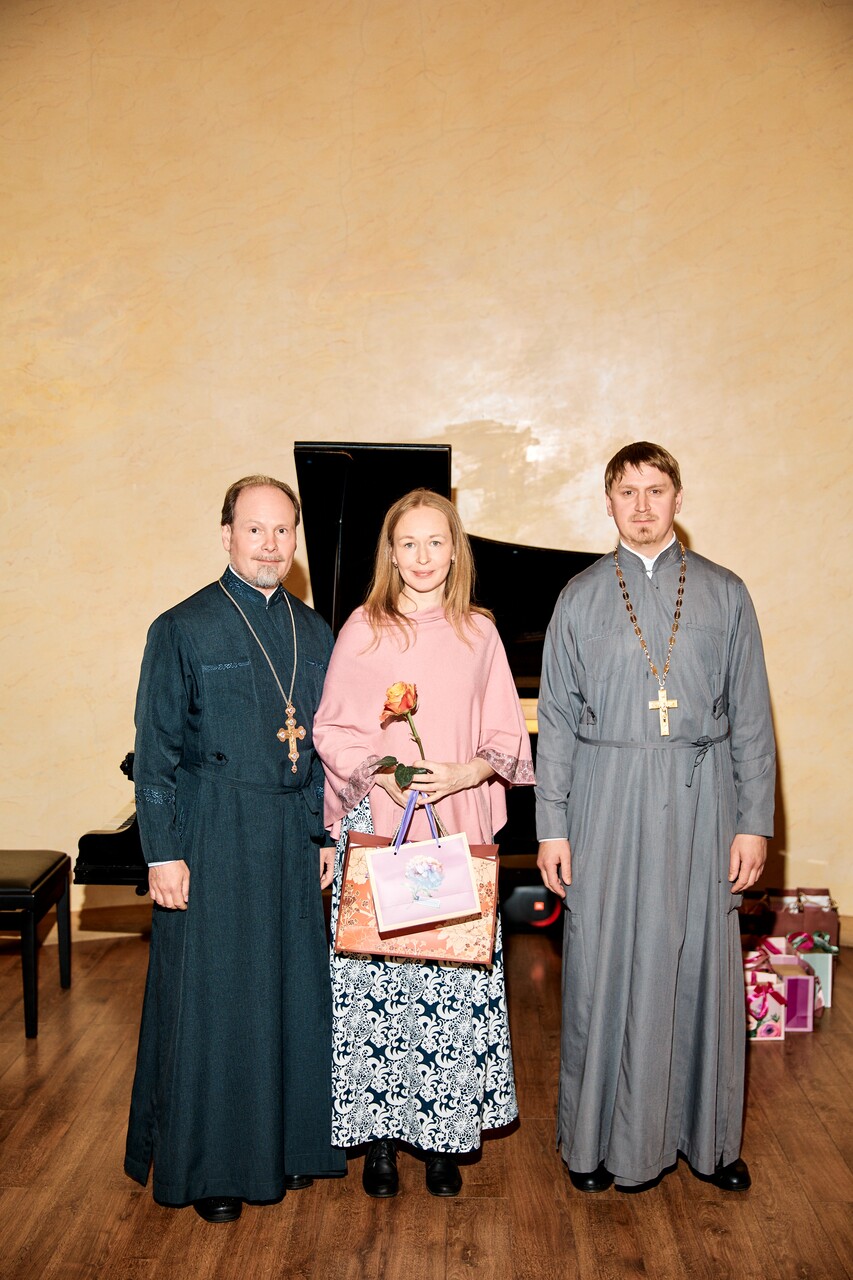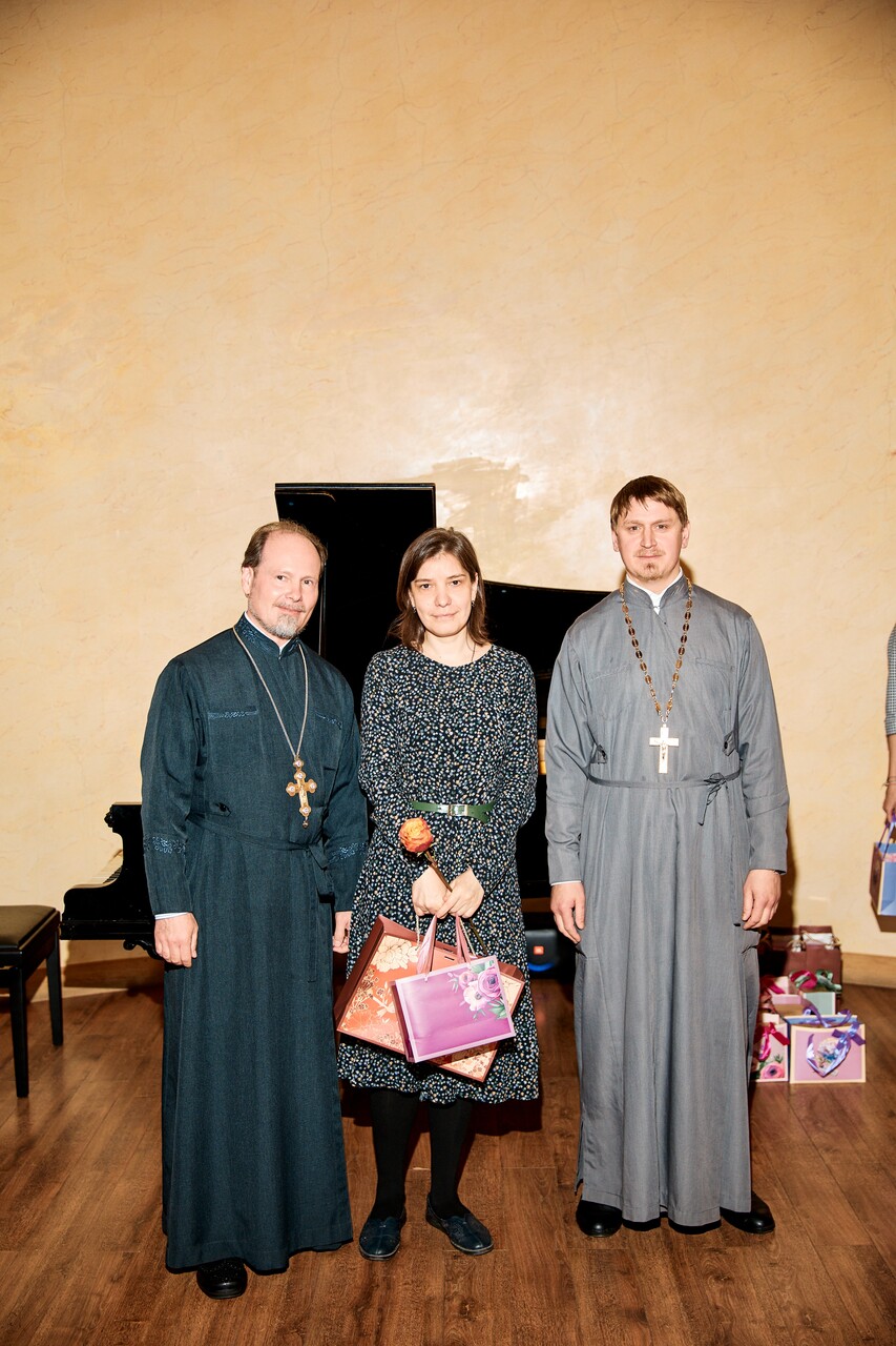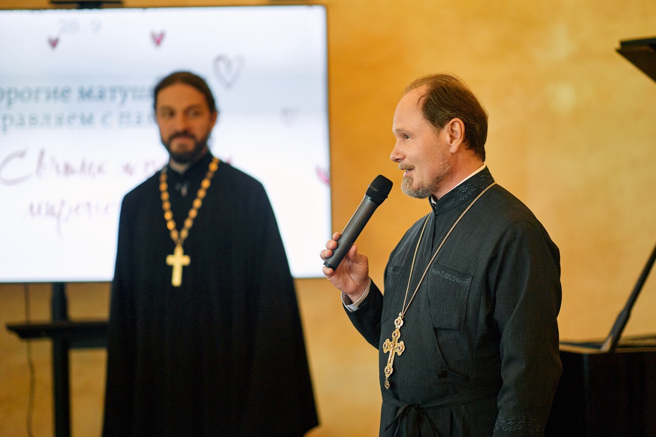 Далее состоялся торжественный акт, который провели организаторы праздника – председатель Комиссии по вопросам семьи, защиты материнства и детства Сергиево-Посадской епархии иерей Александр Насибулин и его супруга Анастасия. С поздравительным словом к гостям обратился благочинный Долгопрудненского церковного округа протоиерей Андрей Хмызов, особо отметивший важность подобных мероприятий, и благочинный Химкинского церковного округа иерей Павел Тарасов, поблагодаривший организаторов встречи и выразивший надежду на дальнейшее развитие этого начинания. Благочинные вручили подарки жёнам священников и отметили труды каждой из матушек на благо семьи и Церкви. Украшением праздника стали музыкальные и песенные номера.