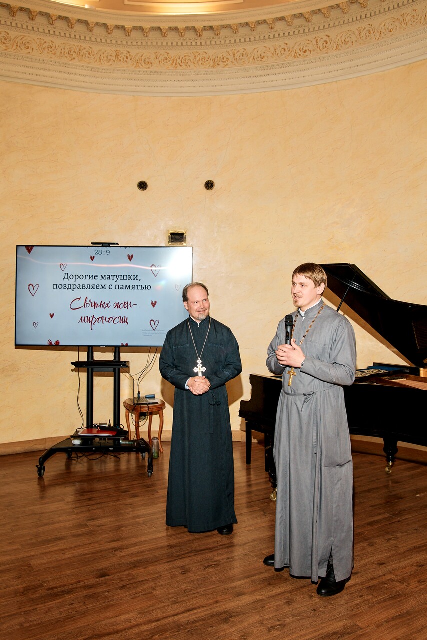 Праздничные мероприятия предварила Божественная литургия в Алексиевском храме д. Середниково, за которой смогли соборно помолиться супруги клириков. По завершении богослужения с приветственным словом к ним обратился настоятель храма иерей Сергий Старокадомский. Отметив особую роль женщины в семье и Церкви, настоятель вручил матушкам цветы.