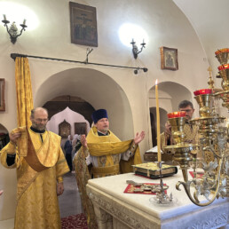 По завершении Литургии было совершено славление перед праздничной иконой. Настоятель храма отец Алексий обратился к молящимся с поздравительным словом, а затем духовенство и всех собравшихся поздравил отец благочинный, протоиерей Андрей Хмызов. Праздник завершился общеприходской праздничной трапезой.