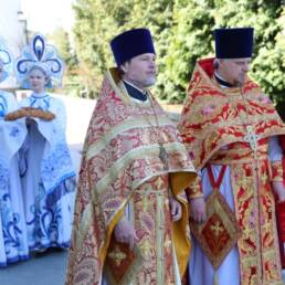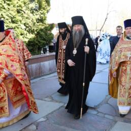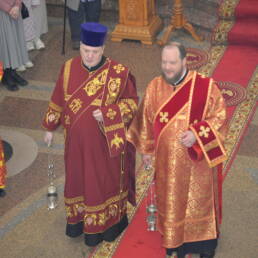 Его Преосвященству сослужили: секретарь Сергиево-Посадского епархиального управления, благочинный Ивантеевского церковного округа протоиерей Иоанн Монаршек; благочинный Долгопрудненского церковного округа, настоятель Преображенского храма г. Долгопрудного протоиерей Андрей Хмызов; руководитель референтуры Святейшего Патриарха Московского и всея Руси Кирилла, настоятель храма иконы Божией Матери «Живоносный Источник» в Царицыне г. Москвы протоиерей Олег Корытко; помощник благочинного Долгопрудненского церковного округа, настоятель Георгиевского храма г. Долгопрудного протоиерей Александр Суворкин; духовенство Долгопрудненского благочиния.