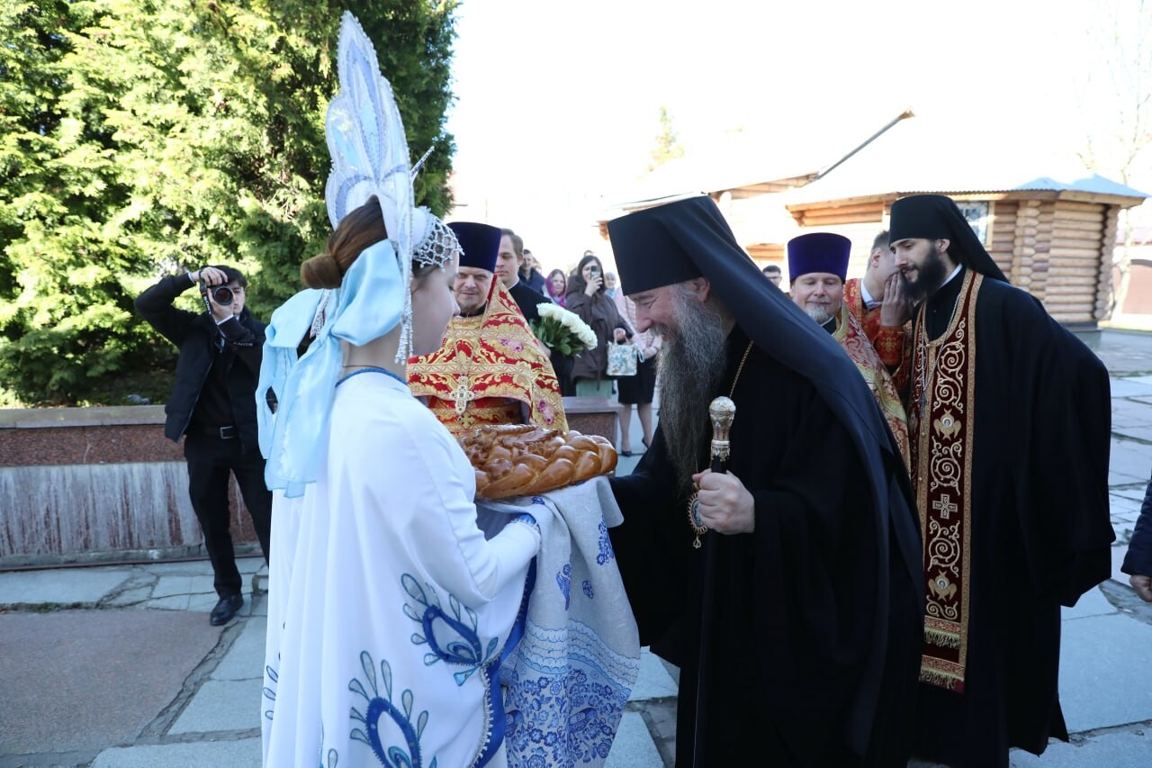 Затем протоиерей Андрей Хмызов поблагодарил епископа Кирилла за архиерейский визит и преподнёс ему пасхальное яйцо от воспитанников воскресных школ.
