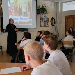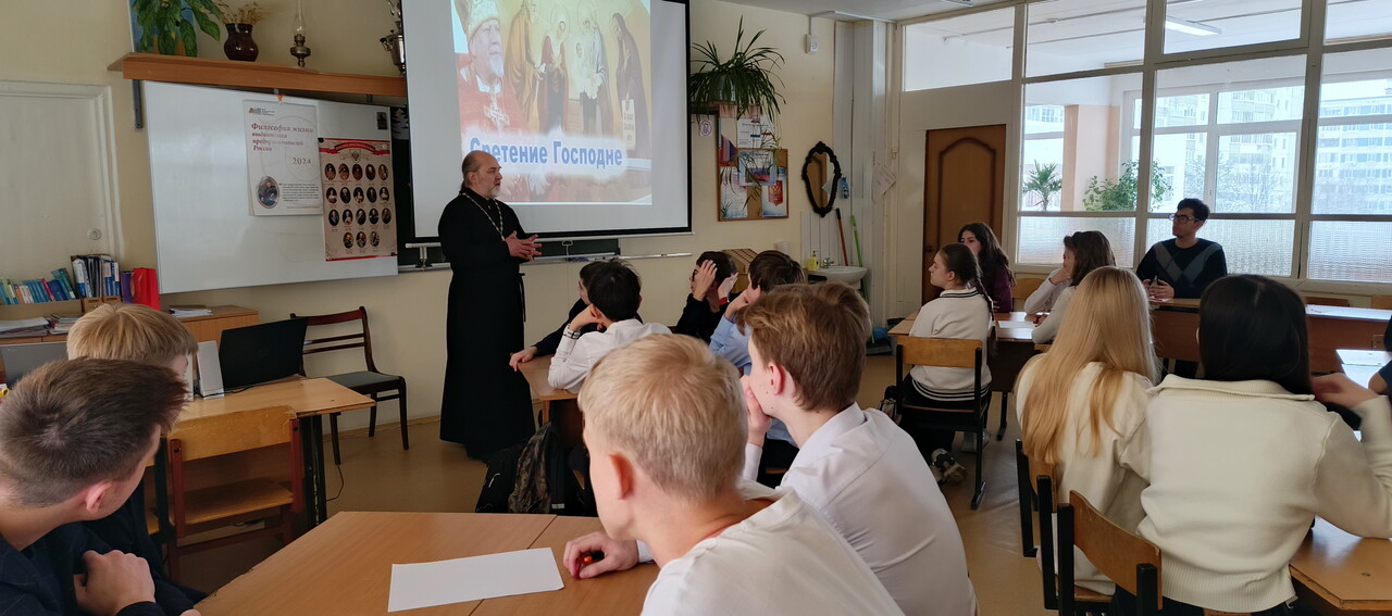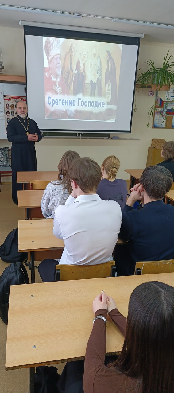 Отец Алексий посетил учеников 8 класса, рассказал ребятам о истории и смысле праздника Сретения Господня и о Дне православной молодёжи. Школьникам была предложена интеллектуальная игра, викторина «Моя православная родина», с вопросами на христианские и исторические темы, где отец Алексий принял участие в составе жюри.