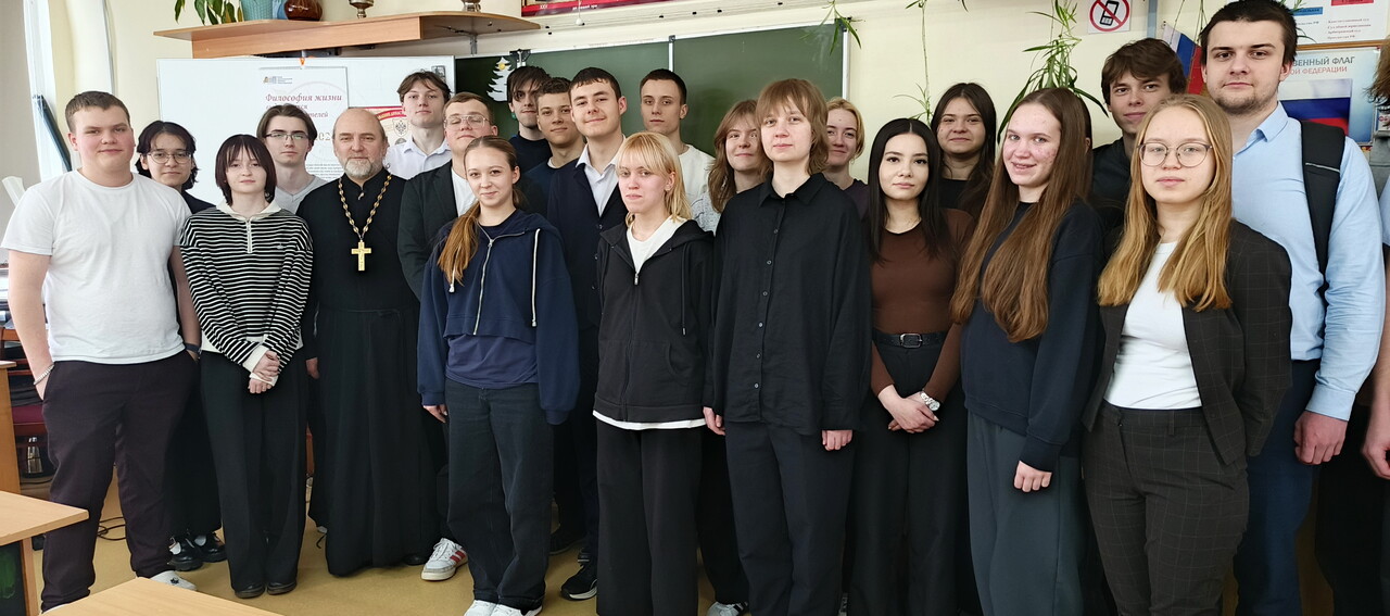 13 февраля, в преддверии праздника Сретения Господня, в МАОУ гимназии 13, для учеников 8–11 классов была организована встреча со священником, клириком храма Георгия Победоносца, иереем Алексием Куприяновым.