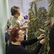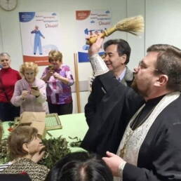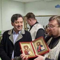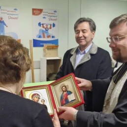 Отец Александр передал участникам мероприятия благословение и приветствие благочинного Долгопрудненского церковного округа протоиерея Андрея Хмызова, окропил изделия, которые помогут защитить защитников Родины в зоне СВО. Также на молитвенную память труженицам образа Спасителя и Пресвятой Богородицы.